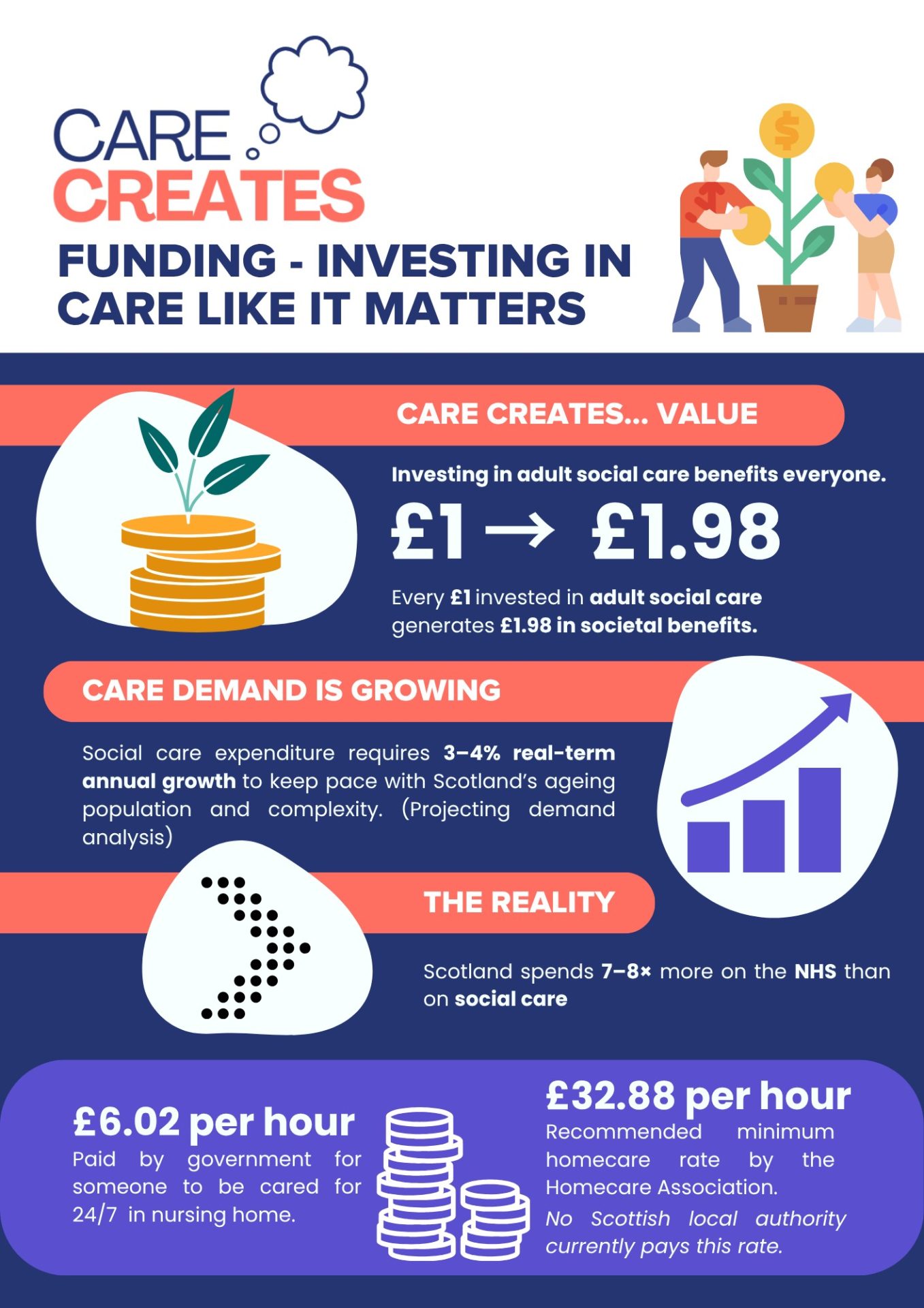 Scotland’s social care story is one of people, communities and the systems that help us live well. Our Funding Week – Stats & Rates infographic highlights why investing in adult social care is not a cost, but a vital investment in Scotland’s wellbeing, economy and future.