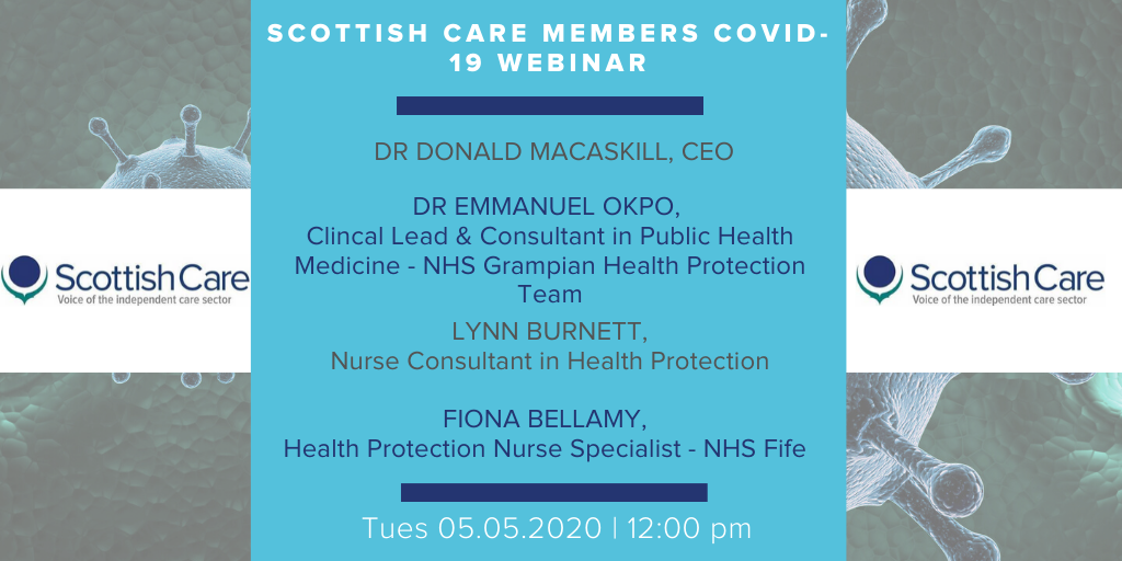 Our next Covid-19 members webinar will take place on Tuesday 5 May at 12:00 pm, hosted by our CEO, Dr Donald Macaskill. Donald will be joined by 3 colleagues from Public Health Scotland including: