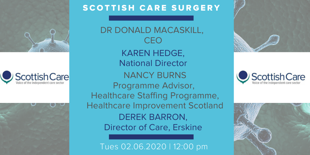 The next Scottish Care Covid-19 Surgery will take place on Tuesday 2 June at 12:00 pm. In this session our CEO, Dr Donald Macaskill and our National Director, Karen Hedge will be joined by Nancy Burns -Programme Advisor Healthcare Improvement Scotland, NMAHP Directorate – and Derek Barron – Director of Care, Erskine.